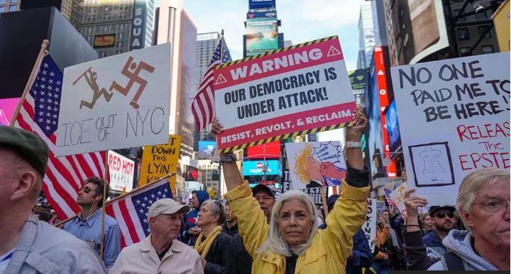 নিউইয়র্ক সিটির বিখ্যাত টাইমস স্কয়ারে সকাল থেকে শুরু হওয়া বিক্ষোভে কয়েক ঘণ্টার মধ্যেই হাজার হাজার মানুষ জড়ো হয়। সড়ক ও সাবওয়ে প্রবেশপথ ভরে যায় প্রতিবাদকারীদের ভিড়ে। অনেকেই হাতে প্ল্যাকার্ড ধরে রেখেছিলেন, তাতে লেখা ছিল—“গণতন্ত্র, রাজতন্ত্র নয়” এবং “সংবিধান ঐচ্ছিক নয়”।