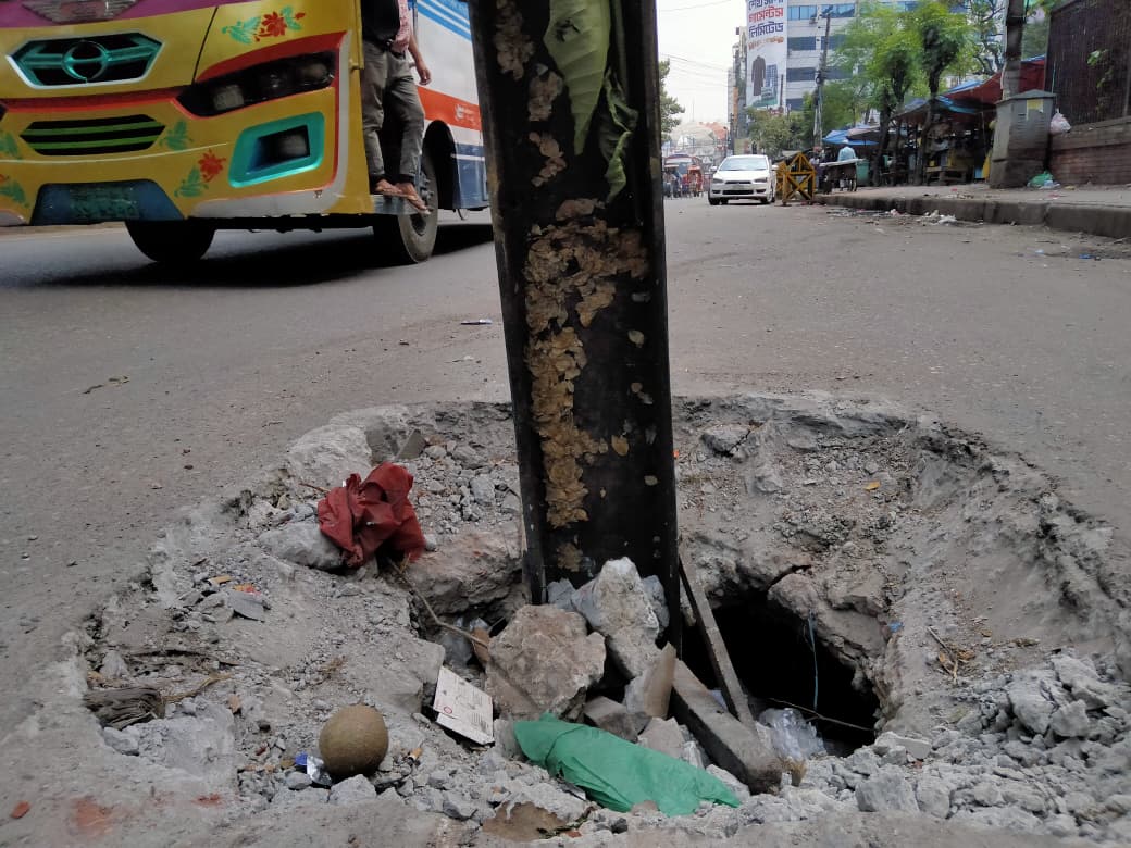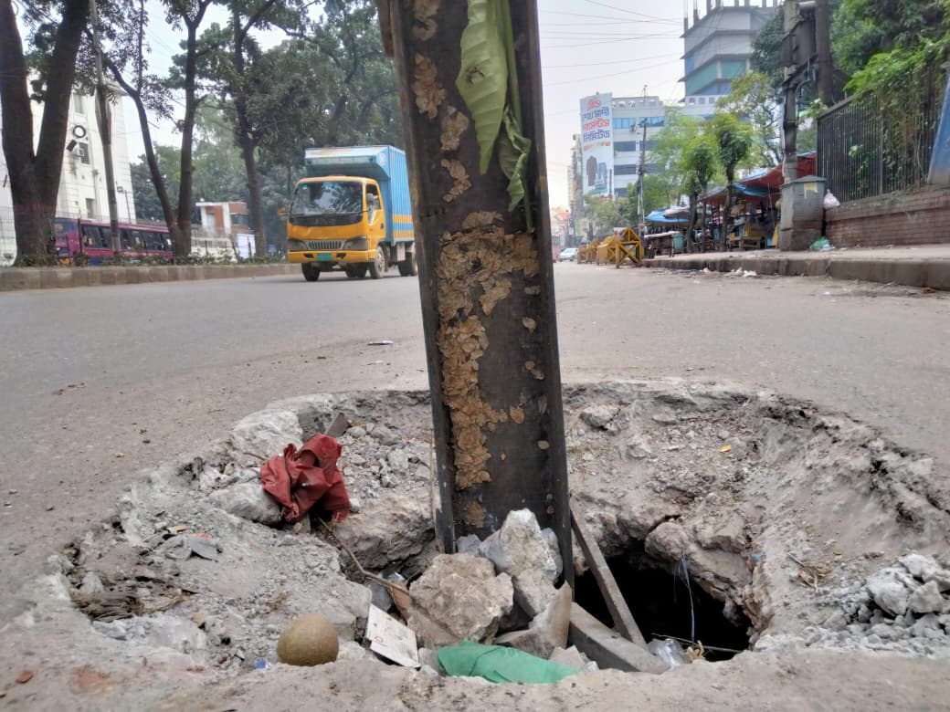 রাজধানীর সচিবালয়ের সামনে রাস্তায় দীর্ঘদিন ধরে রয়েছে একটি খোলা গর্ত। রাস্তার মাঝখানে বৈদ্যুতিক খুঁটির গোড়ায় তৈরি হয়েছে বড় ফাঁকা জায়গা। যে কোনো মুহূর্তে সেখানে ঘটতে পারে দুর্ঘটনা।