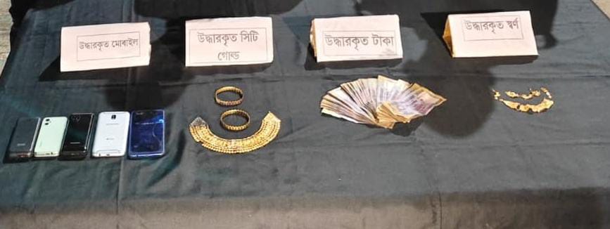 অভিযানে উদ্ধার করা হয়েছে ১ ভরি ১০ আনা স্বর্ণালঙ্কার, ৮ ভরি ২ আনা সিটি গোল্ড অলঙ্কার, নগদ ৮০ হাজার টাকা এবং ৫টি মোবাইল ফোন।