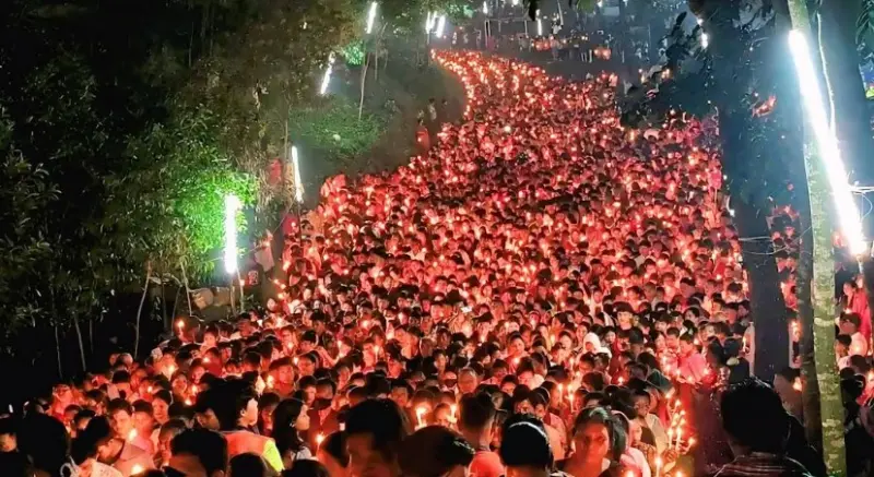 মোমবাতির আলো হাতে হাজারো ভক্ত পাড়ি দিলেন প্রায় দুই কিলোমিটার উঁচু-নিচু পাহাড়ি পথ। ভক্তদের কণ্ঠে তখন একসুরে ধ্বনিত হচ্ছিল, “হে ঈশ্বর জননী, আমরা পাপী, আমাদের তুমি ক্ষমা করো।” প্রার্থনা ও মোমবাতির আলোয় আলোকিত হয়ে উঠেছিল পুরো পাহাড়।