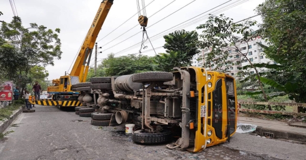 বনশ্রীতে কন্টেইনার উল্টে তীব্র যানজট