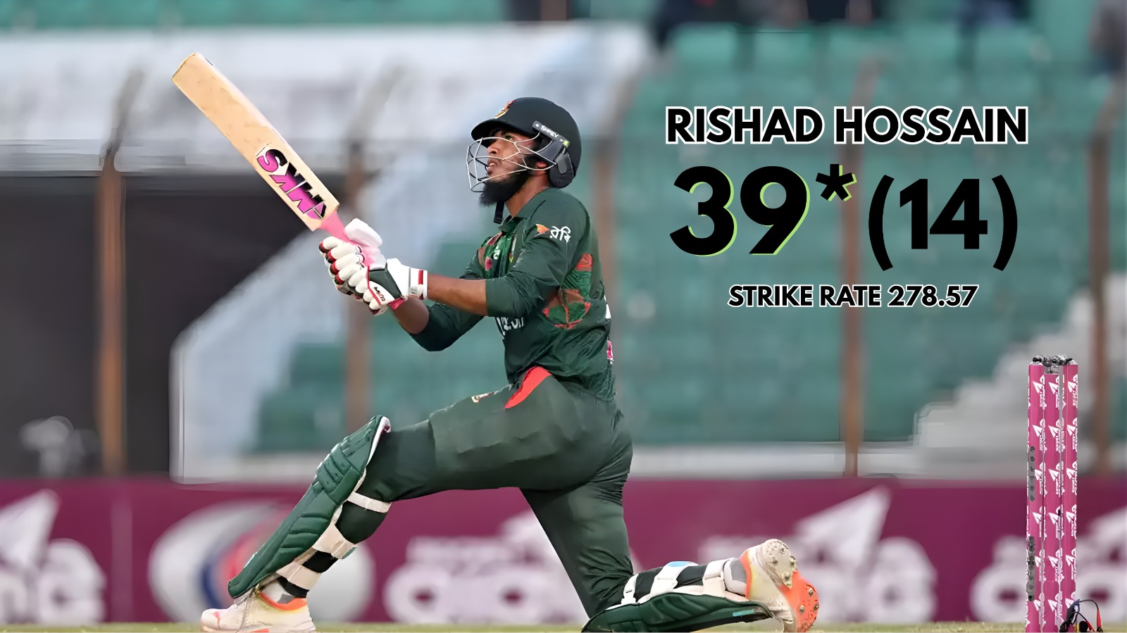 কিন্তু ইনিংসের আসল উত্তেজনা আসে শেষ দিকে রিশাদ হোসেনের ব্যাট থেকে। মাত্র ১৪ বলে বিধ্বংসী ৩৯ রানের ঝড় তোলেন এই তরুণ অলরাউন্ডার। তার ইনিংসে ছিল ৩টি ছক্কা ও ৩টি চার, যা দলকে ২০০ রানের গণ্ডি পেরোতে বড় ভূমিকা রাখে।